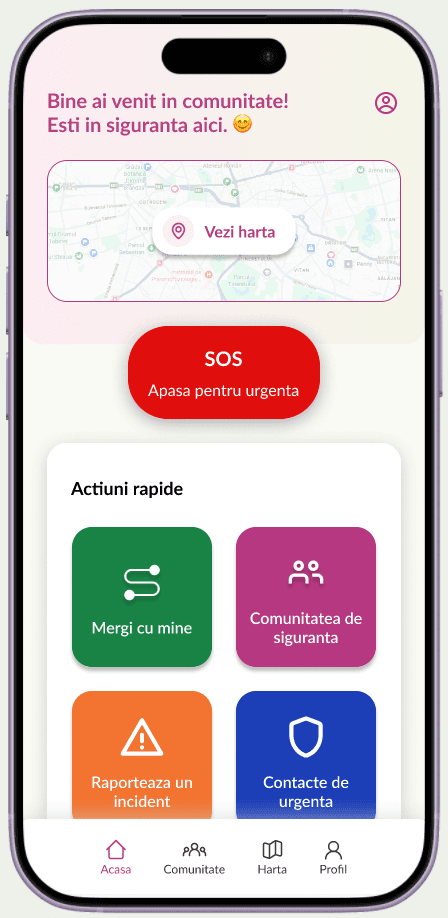 Prima aplicație din Romania care pune siguranța femeilor pe primul loc, prin comunitate, ajutor imediat, prevenție și tehnologie.